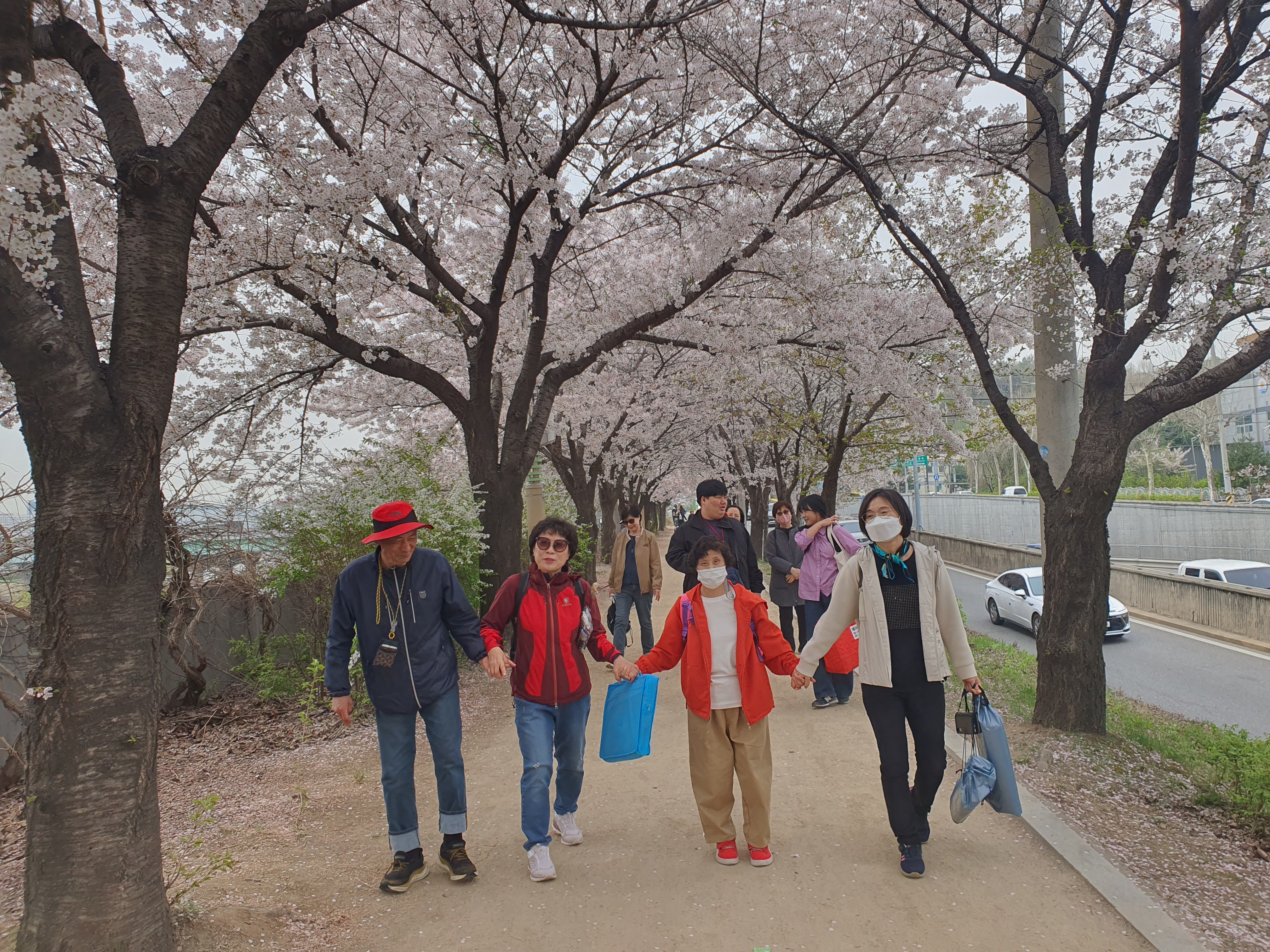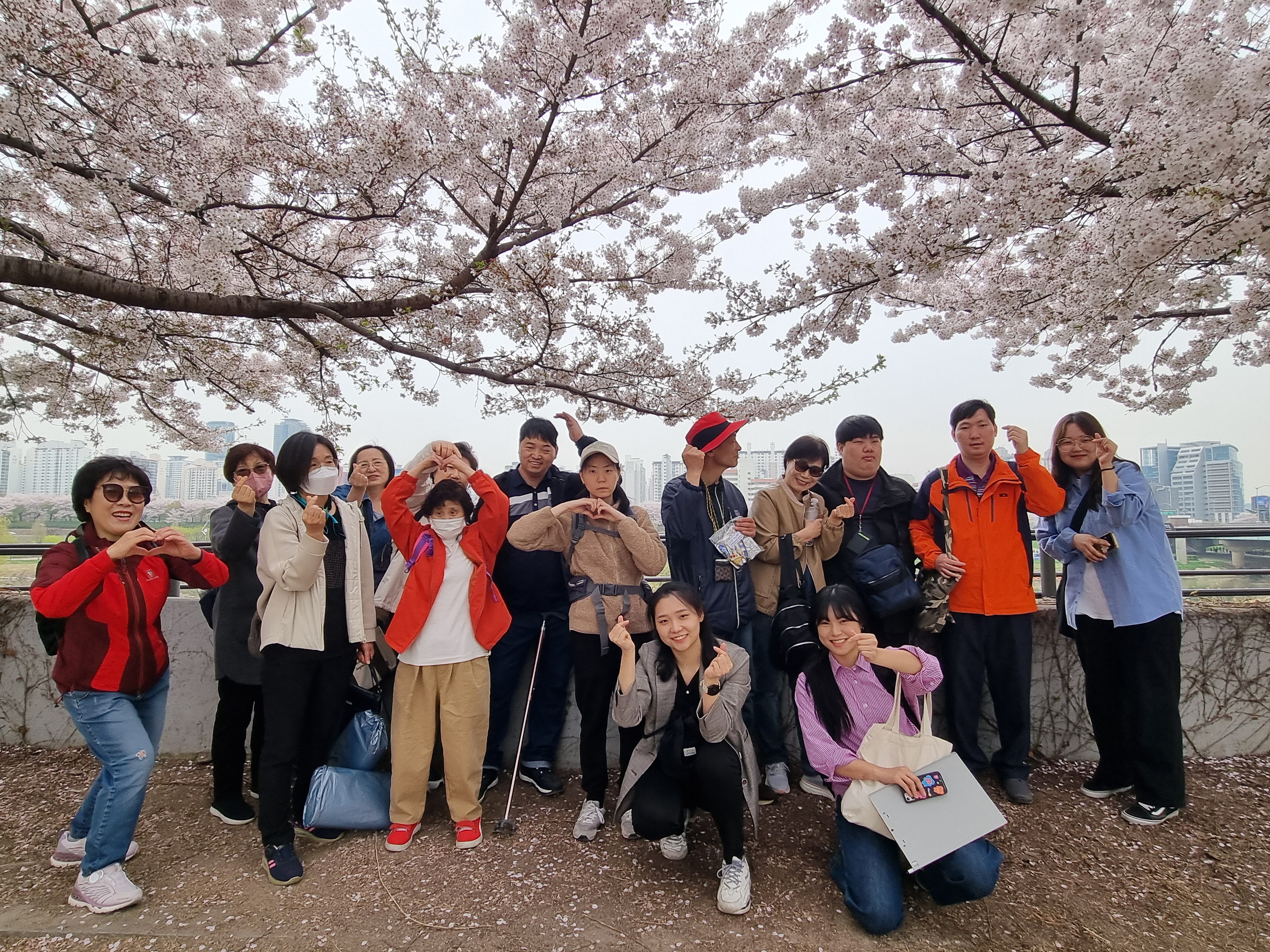 벚꽃이 만개한 안양천 벚꽃길에서 다 같이 사진을 찍었습니다.