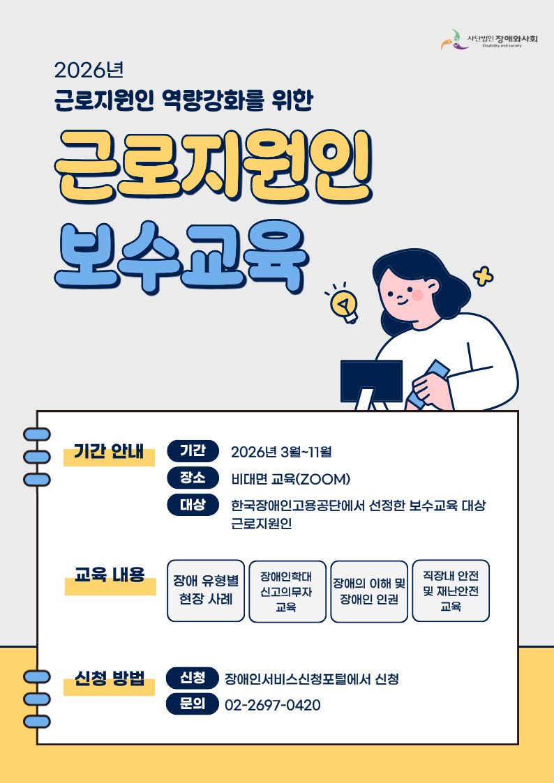 1. 장애와사회(회장 이상희, 이하 ‘장애와사회’)는 한국장애인고용공단으로 「2026년 근로지원인 보수교육사업 위탁 수행기관」으로 선정됐다. 근로지원인 보수교육은 양성교육 이수 후 3년이 지난 재직 근로지원인의 직무 역량 강화를 목적으로 운영된다.